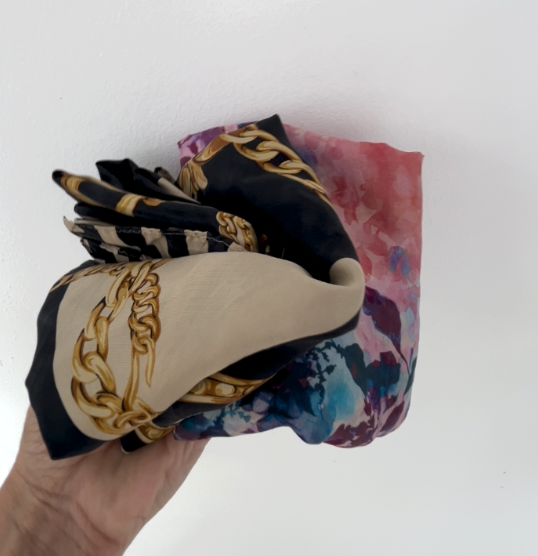 TOP TIP: I tend to source my silk scarves from charity shops, Vinted and eBay often costing less than a fiver. A sustainable option that saves the pennies, and looks good.